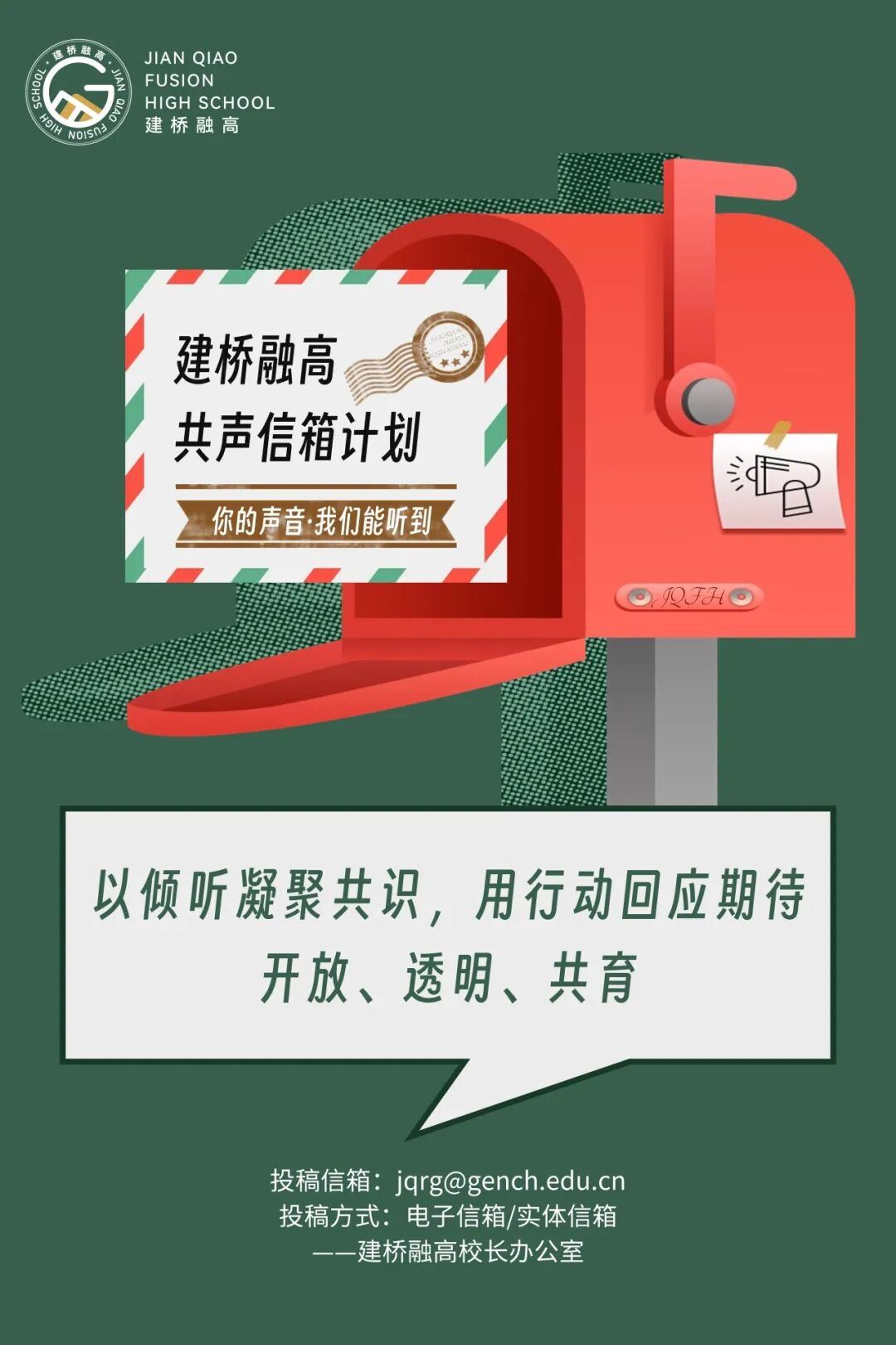 秋意渐浓,建桥融高校园里处处洋溢着求知的热情。我们始终相信,每一次真诚的沟通都是教育进步的契机,每一个宝贵的建议都是学校发展的动力。为更好地倾听大家的心声,构建更加开放、透明、和谐的校园环境,经过精心筹备,我校共声信箱计划即日起正式建立并投入运行!