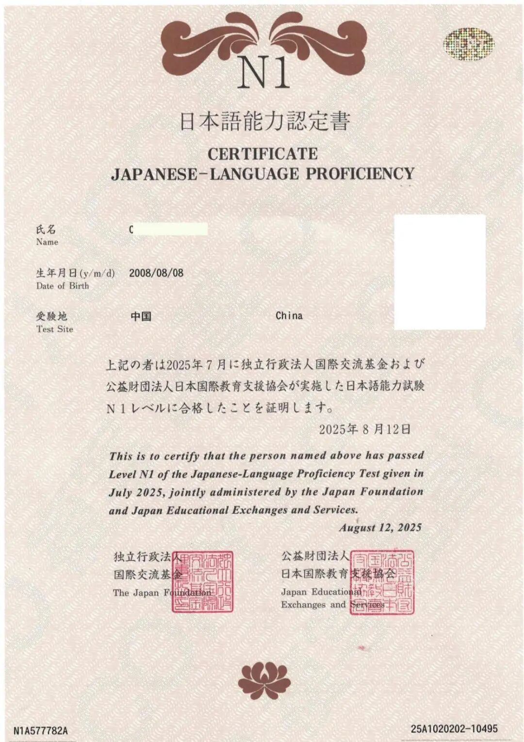 日高部部分JLPT合格证书